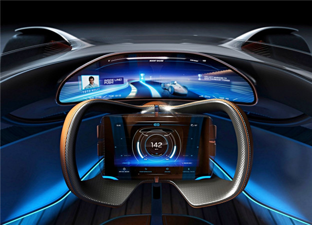 開放式的單座設定,用上像是鋁合金、胡桃木、馬鞍棕色真皮等材料打造出奢華科技感,前方的大型投射螢幕甚至可以透過人工智能的幫助,與經典 Silver Arrow 賽車進行「虛擬競賽」,Virtual Race Coach 輔助功能還會在比賽期間下達指令 (圖片左方照片為現任Mercedes-AMG車隊執行董事Toto Wolff)。